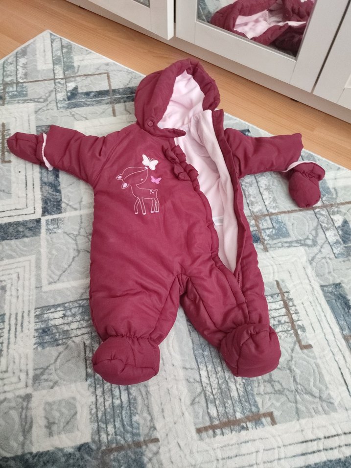 Bordo renkli kız bebek tulumu, fermuarlı ve yakası notched lapel. Yumuşak ve sıcak kumaştan, geyik ve kelebek desenli.