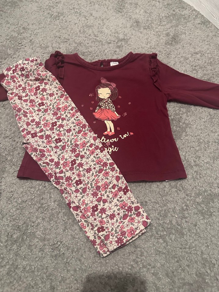 Bordo renkli, fırfırlı uzun kollu üst ve çiçek desenli pantolondan oluşan kız bebek takımı.