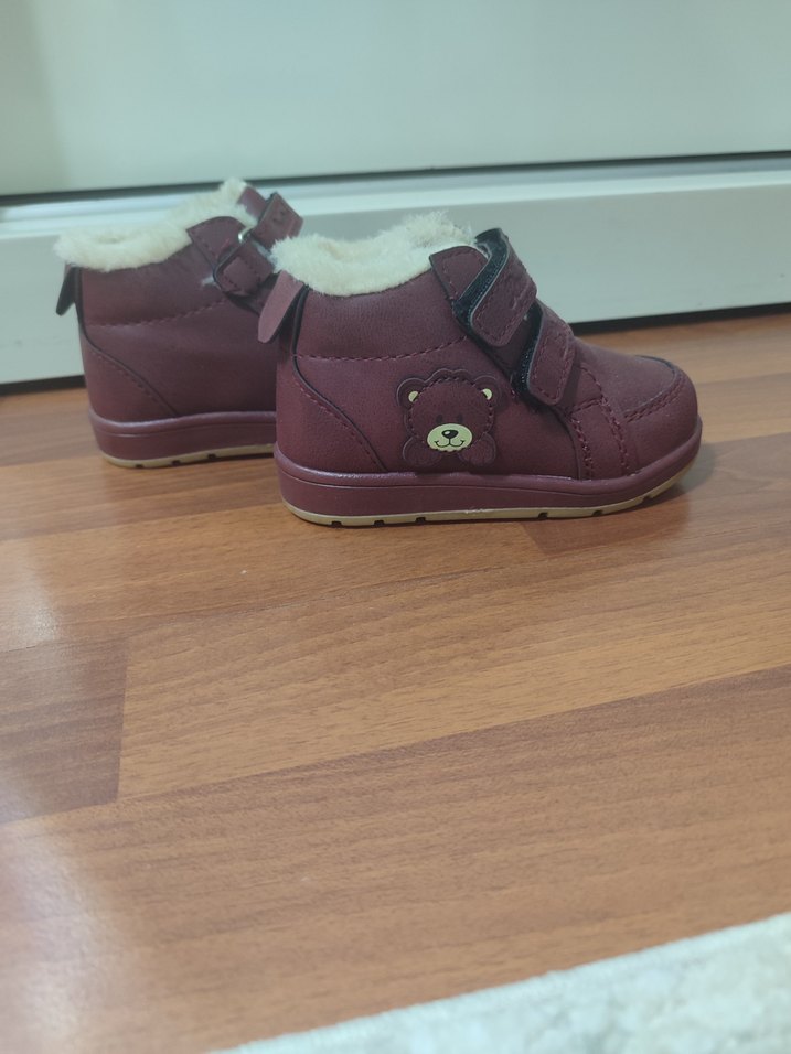 Bordo renkli, tokalı kız bebek ilk adım ayakkabısı. Yumuşak astarlı ve ayıcık detaylı, günlük sokak stiline uygun.