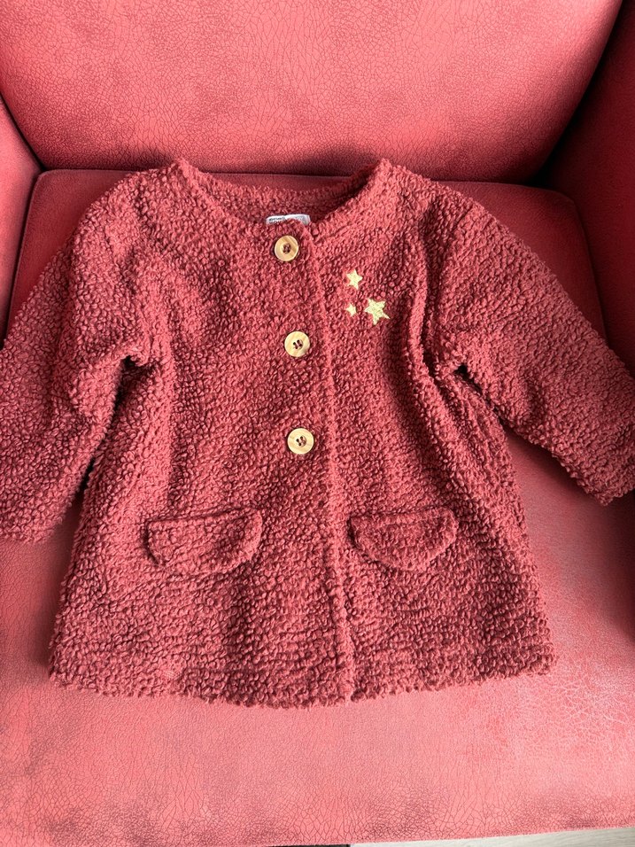 Bordo renkli, düğmeli peluş kız çocuk ceketi. Salaş kesim, kesik yaka ve renkli nakış detaylarına sahiptir. Önünde cepler bulunur.