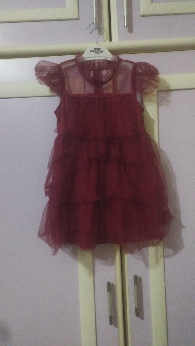 Bordo renkli, kolsuz, yüksek yakalı ve fırfırlı katmanlara sahip kız çocuk elbisesi. Yumuşak sentetik kumaştan üretilmiştir. nişan düğün özel gün için uygundur