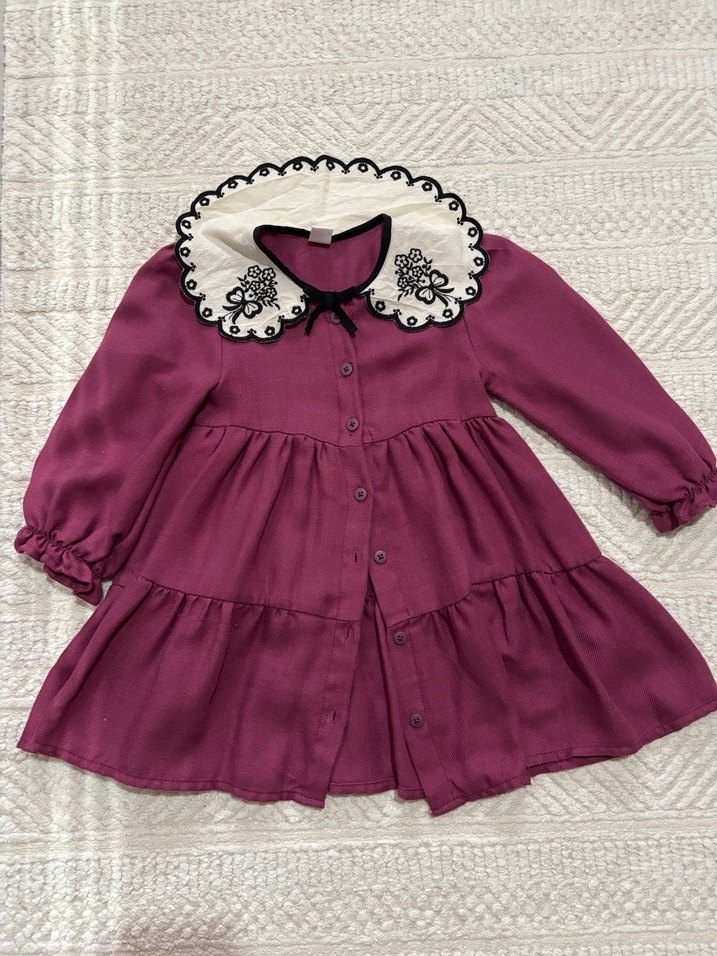 Bordo renkli, örme kumaştan, uzun kollu, fırfırlı yakalı ve nakış detaylı bol kesim kız çocuk elbisesi. Bohem tarz için uygundur.