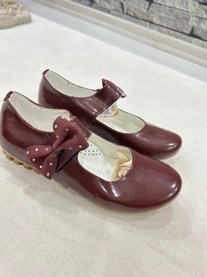 Bordo renkli kız çocuk babet ayakkabılar, yumuşak görünümlü yüzey ve süslü fiyonk detayı ile rahat kauçuk tabana sahiptir.