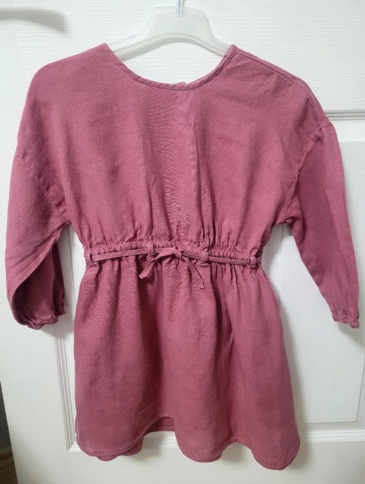 Bordo renkli kız çocuk elbisesi, uzun kollu, yuvarlak yakalı ve düğmeli bel bağcığına sahip bol kesimdir. Yumuşak keten kumaştan yapılmıştır, sade ve bohem tarzda. Gülkurusu renginde yeni gibi 2 kere giyildi