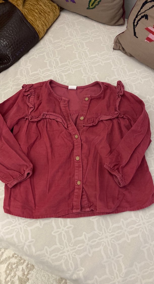 Bordo renkli, keten kumaştan yapılmış uzun kollu kız çocuk bluzu. Fırfırlı ve yakalı, bol kesim bohem tarzda, yumuşak dokulu.