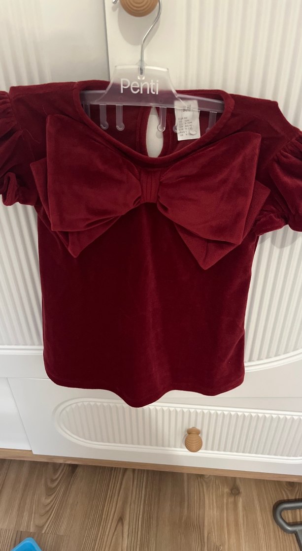 Bordo renkli, kısa kollu, bisiklet yaka ve büyük fiyonk detaylı kız çocuk elbisesi. Yumuşak ve sıcak kumaştan, klasik ve gotik tarzda şık bir model. Tam bedendir