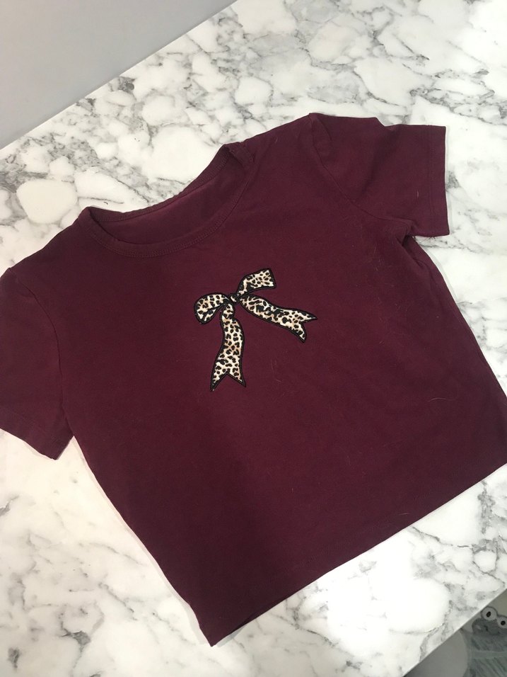 Bordo renkli, kısa kollu, yuvarlak yakalı kız çocuk tişörtü. Baskılı fiyonk detayı ve bol kesimiyle rahat bir kullanım sunar.