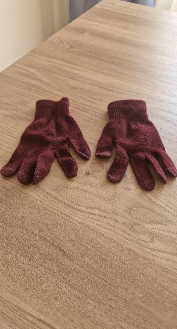 Bordo renkli, örgü yünden yapılmış kız çocuk eldivenleri, düz ve desensiz tasarımıyla sıcaklık ve sadelik sunar. iyi durumdadır.
