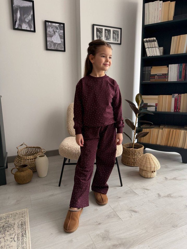 Bordo renkli kız çocuk eşofmanı, salaş kesim ve uzun kollu, bisiklet yaka tasarıma sahiptir. Yumuşak ve sıcak kumaştan, koyu batik desenlidir. Rahat ve şık bir görünüm sunar.
