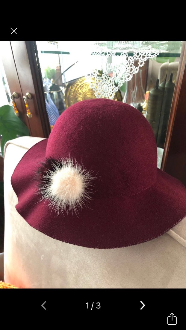 Bordo renkte şapka, geniş kenarlı ve kürk detaylıdır, bohem tarzıyla nostaljik Paris havası taşır. Baş çevresi ölçüsü 55