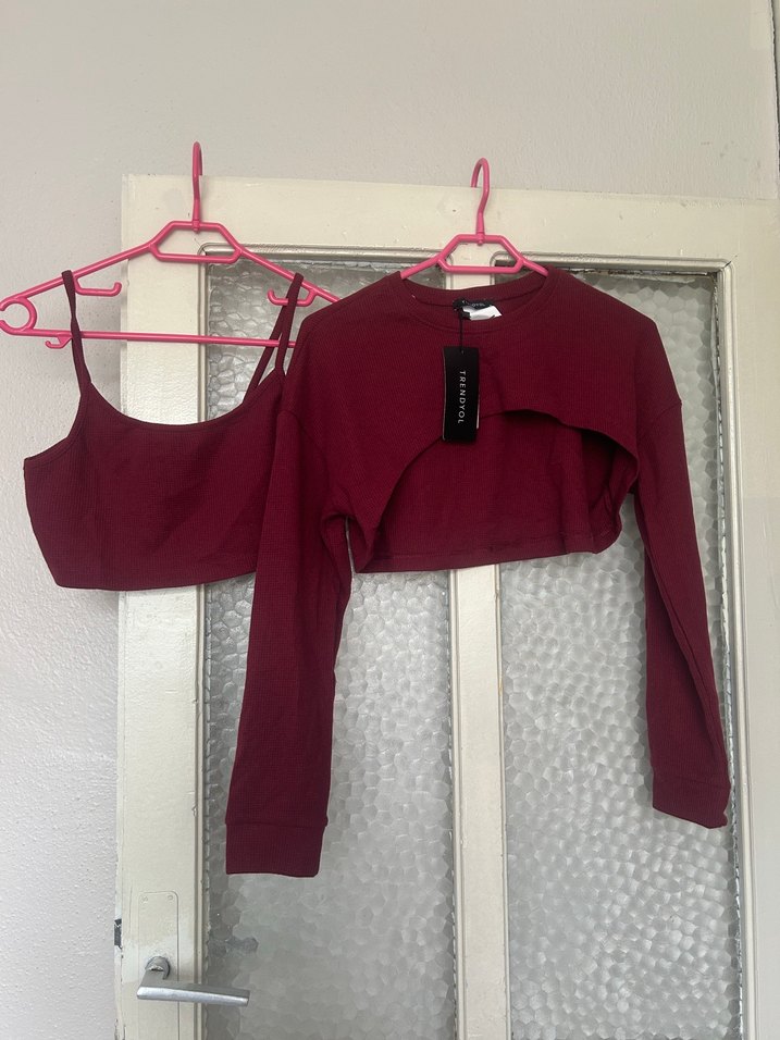 Bordo renkli, straplez crop top ve uzun kollu bolerodan oluşan takım. Düz ve şık sentetik kumaştan, rahat ve şık bir görünüm sunar.