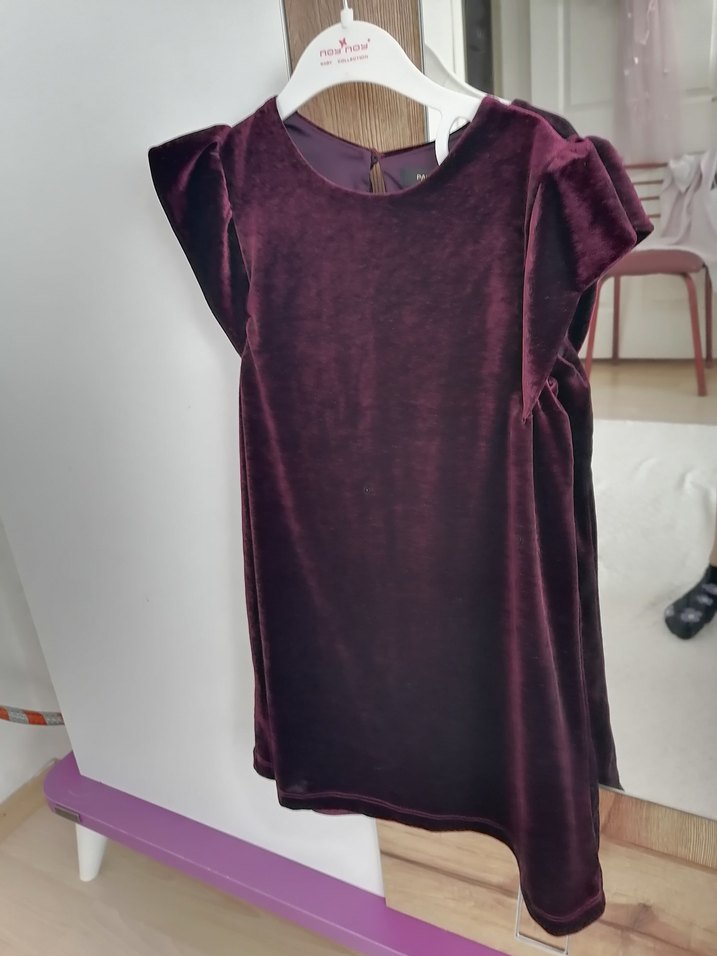 Bordo renkli süet kumaştan yapılmış, kısa kollu ve yuvarlak yakalı, salaş kesimli kız çocuk elbisesi. Drapeli tasarımıyla şık ve rahat.