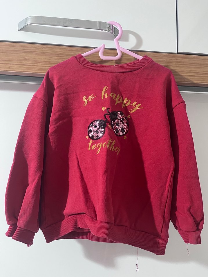Bordo renkli, uzun kollu, bol kesim kız çocuk sweatshirt. Önünde "so happy together" yazısı ve örme detaylı baskı bulunur. Yumuşak ve sıcak kumaş.