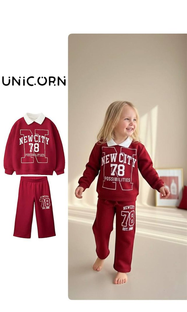 Bordo renkli kız çocuk eşofman takımı, bol kesim ve uzun kolludur. Yumuşak kumaştan, renkli baskılar ve dantel detaylarıyla trend bir görünüm sunar. Üzerinde "78, POSSIBILITIES, NEWCITY, UNICORN" yazıları bulunur. COLLEGE TEAM YAKALI TAKIM 3 iplik Bedenler 2 3 yaş 4 5 yaş