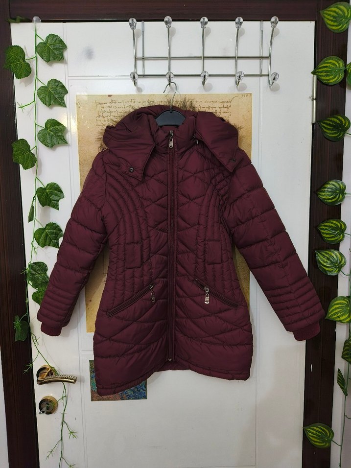 Bordo renkli, uzun mont. Uzun kollu, kesikli yakalı ve kürk detaylı. Yumuşak sentetik kumaştan, günlük ve sokak stili için uygun. Omuz genişliği 40 uzunluğu 70 cm