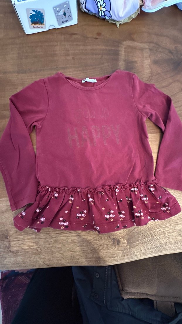 Bordo renkli, uzun kollu, bol kesim kız çocuk tişörtü. Yuvarlak yaka ve fırfırlı etek ucu, çiçekli baskılı desenle. Yumuşak ve sıcak kumaştan. Panço marka, kumaşı çok kaliteli. Sadece öndeki baskıların simleri dökülmüş.