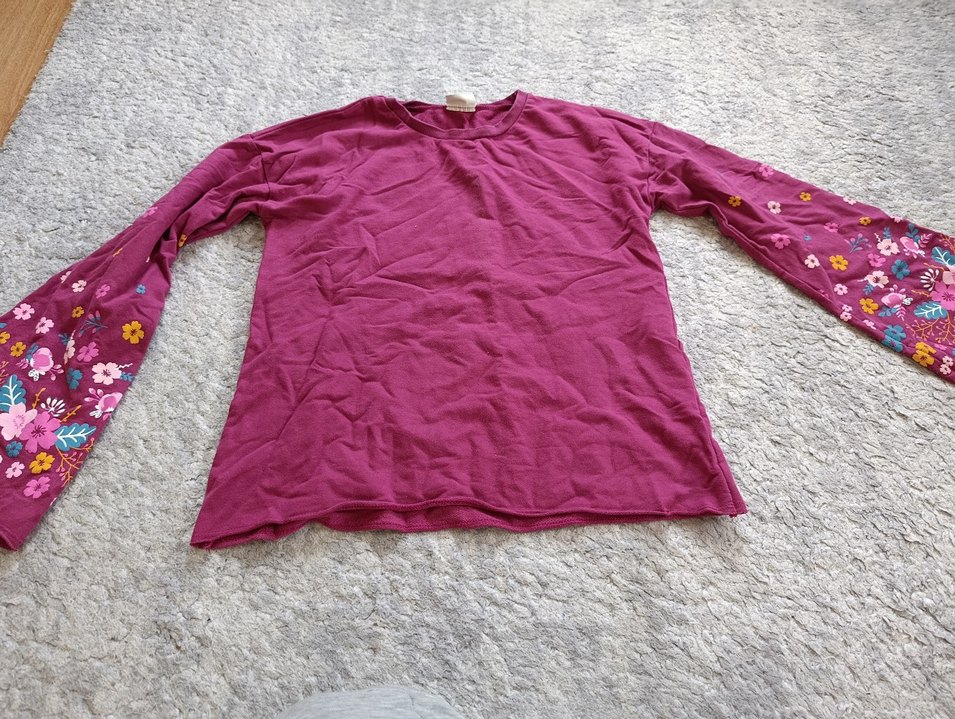 Bordo renkli, keten kumaştan yapılmış kız çocuk uzun kollu, rahat kesim ve yuvarlak yakalı sade tişört.