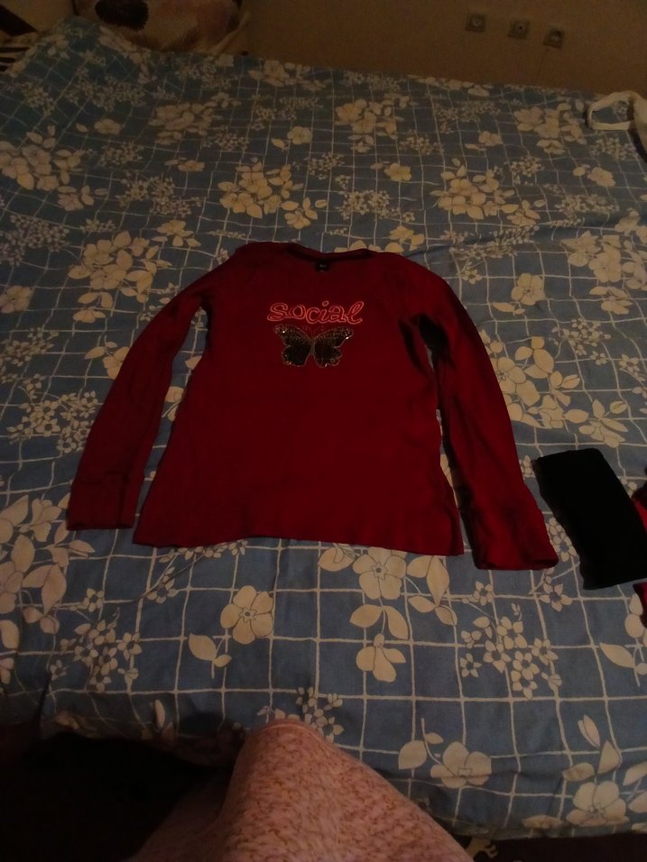 Bordo renk, uzun kollu, kumaştan yapılmış, bol kesim kız çocuk tişörtü. Önünde kelebek ve "social" baskısı bulunur, rahat sokak stili için uygundur.