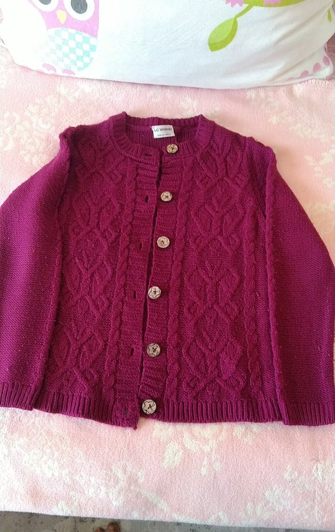 Bordo renkli kız çocukları için örme hırka klasik tarzda. Dokulu örgü deseni ve düğmeli kapama özelliğine sahiptir.