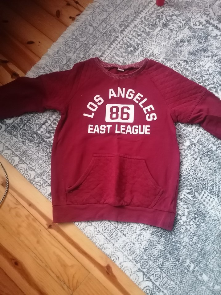Bordo renkli, uzun kollu, bol kesim kız sweatshirtü. Yumuşak ve sıcak dokulu, örgü kumaştan ve "86 Los Angeles East League" baskılıdır. Ön cebine sahiptir.