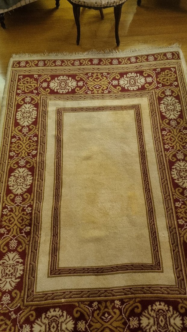Bordo parlak kenarlı klasik desenli halı, bej renkli ortasıyla geleneksel bir görünüm sunar. 180×260