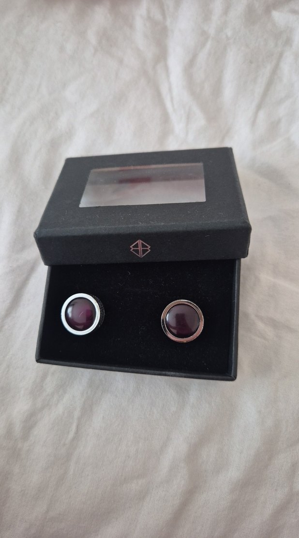 Klasik zarif tasarımlı, koyu bordo renkte erkek kol düğmeleri. Siyah kutusunda, iş ve gotik stiller için uygun.