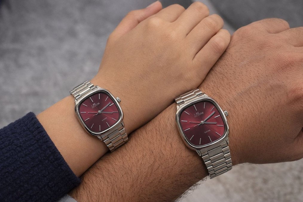 Bordo parlak kadranlı, çağdaş tasarımlı ve metal kayışlı klasik erkek kol saati. ⌚