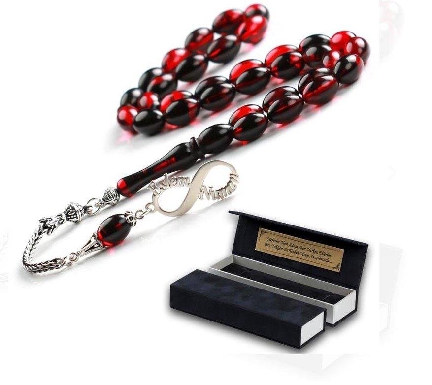 Bordo renkte, klasik tasarımlı erkek tesbih. Pürüzsüz koyu boncuklar ve sonsuzluk sembollü gümüş detay içerir. Siyah kadife kutuda saklanır. Kehribardır.