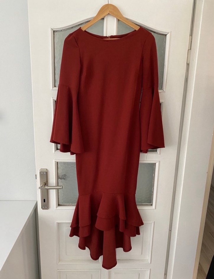 Bordo renkli, uzun fırfırlı kollu, etekleri fırfırlı, arkası fermuarlı ve dar balık kesim elbise.