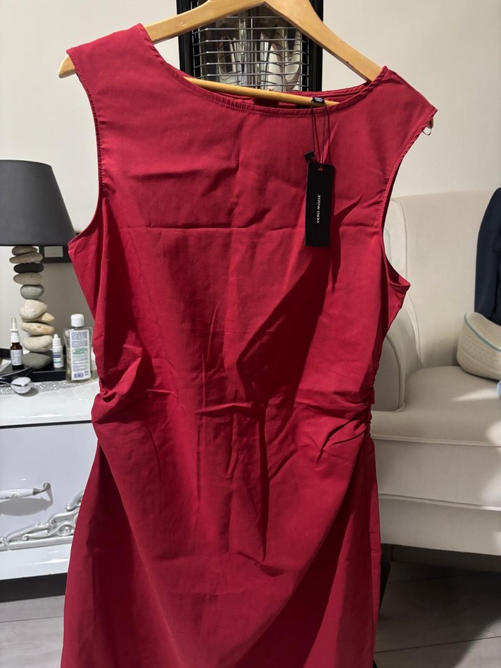 Bordo renkte, kolsuz elbise, yumuşak sentetik kumaştan olup, ofis için sade ve şık bir görünüm sunar.