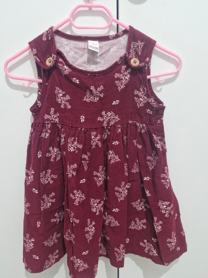 Bordo renkli, düğmeli, kolsuz, bol kesim kız çocuk elbisesi. kadife kumaştan, straplez yakalı ve çiçek desenli, bohem tarzında.