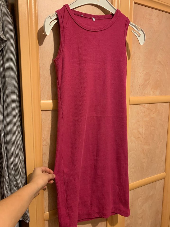 Koyu bordo renkte, kolsuz, normal boy midi elbise. Yuvarlak yakalı, sade ve minimalist tasarımlı, sentetik dokulu kumaştan, günlük kullanıma uygun.