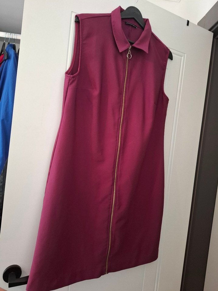 Bordo renk, kolsuz midi elbise, yakalı ve ön fermuarlı. Düzenli kesim ve parlak yüzey sunar, ofis ve sokak stili için uygundur.