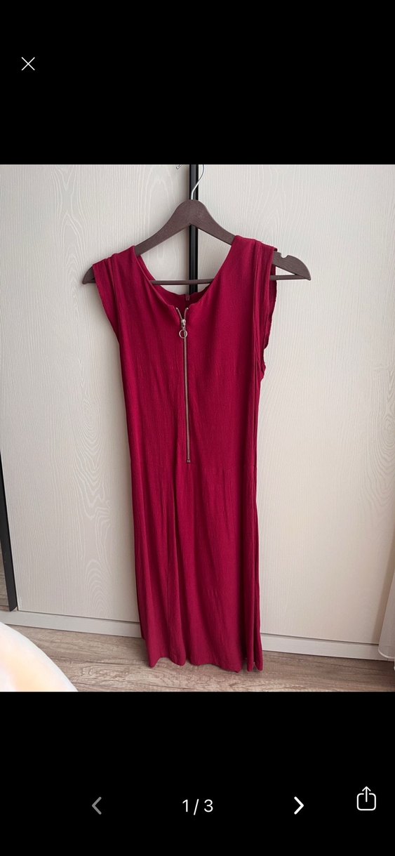 Bordo renkli, kolsuz midi elbise, V yaka ve ön fermuar detayına sahip