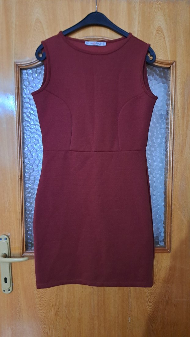 Bordo kolsuz, dar kesim triko elbise. Düz, suni kumaştan, drapeli ve midi boyda, ofis için uygun.