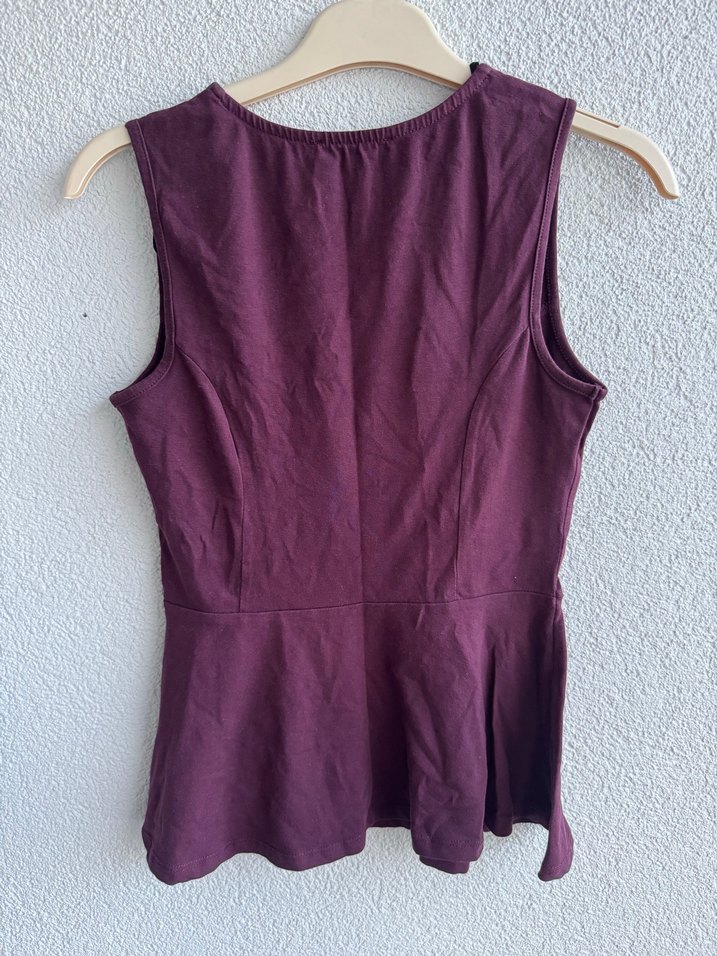 Bordo renk, kolsuz keten bluz, V yaka ve drapeli, rahat kesimiyle günlük sokak giyimine uygun.