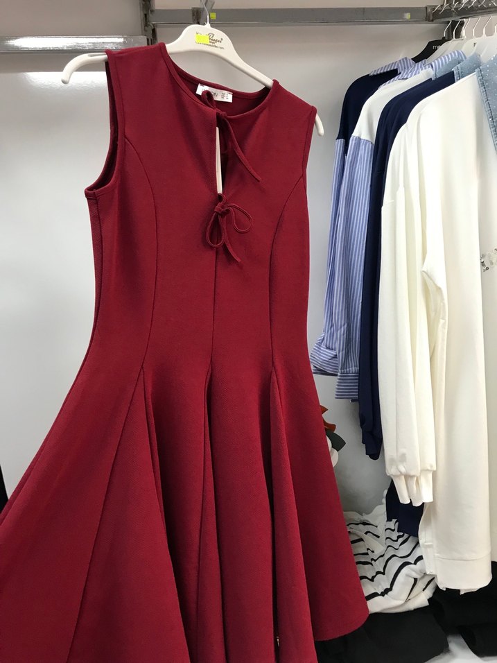 Kolsuz bordo midi elbise, v yaka ve yakada bağcık detayıyla. Yumuşak sentetik kumaştan, pileli etekli ve vücuda oturan kesim. Modern klasik tarzda, günlük kullanıma uygun.