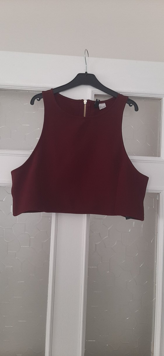 Bordo renkli, kolsuz ve yüksek yakalı, kısa kesim crop top. şık pamuklu kumaştan, akşamlar için uygun. h&m marka l beden bordo renkte koyu
