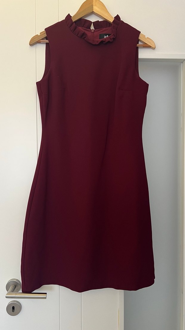 Bordo renkli, kolsuz ve yüksek yakalı bu midi elbise, drapeli detaylarıyla modern klasik ofis şıklığı sunar. Minimalist ve desen içermeyen tasarım.