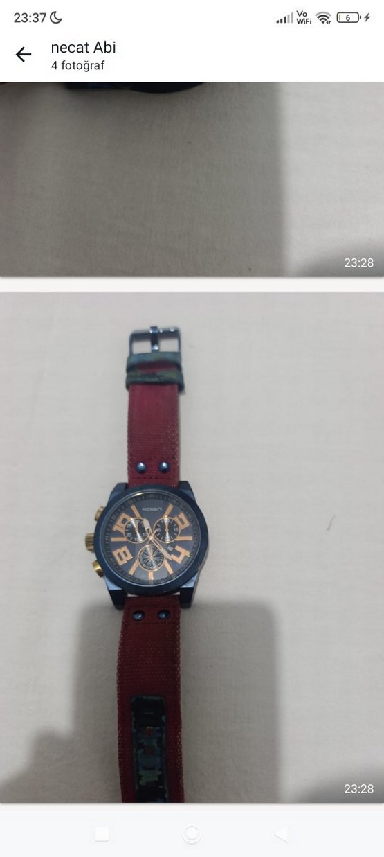 Bordo renk kordonlu, büyük rakamlı kadranlı erkek sokak stili saat. Saat 23:28 gösteriyor. ⌚