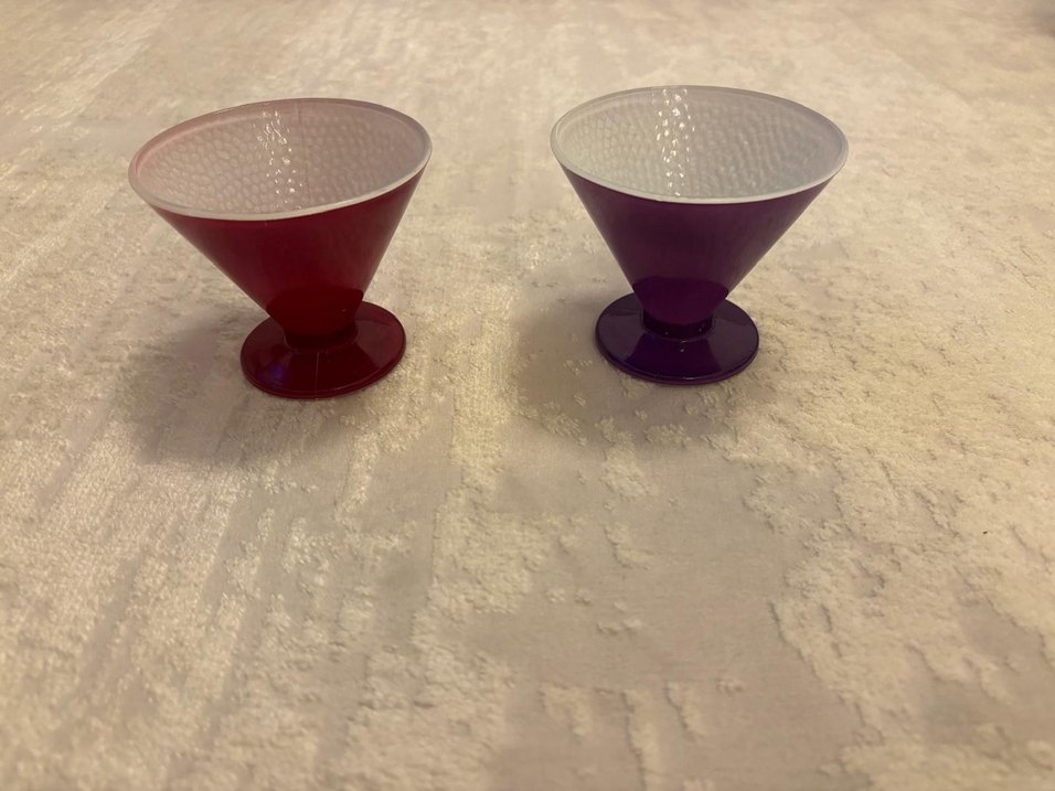 İç yüzeyi dokulu, koyu bordo renkli iki konik Kase. Sağlam tabanlı ve pürüzsüz yüzeye sahip, Dondurma veya Tatlı servisi için uygun. 3 er adet bulunmakdir.Belirtilen fiyat adettir.