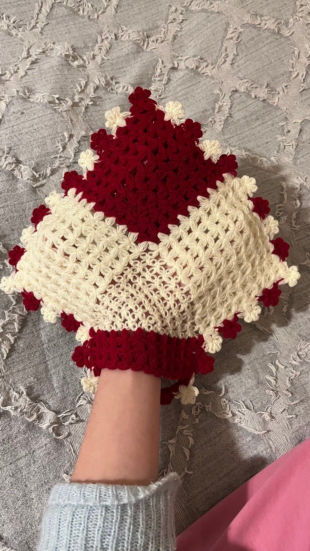 Bordo ve krem renkli, el yapımı örgü banyo lifi, yumuşak dokusuyla nazik temizlik sağlar. El içeri geçirmek için küçük girişi ve asmak için kulpu var.