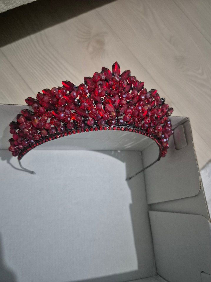 Bordo cam taşlarla süslenmiş, parlak ve gotik tarzda kadın taç, klasik zarafeti yansıtır.