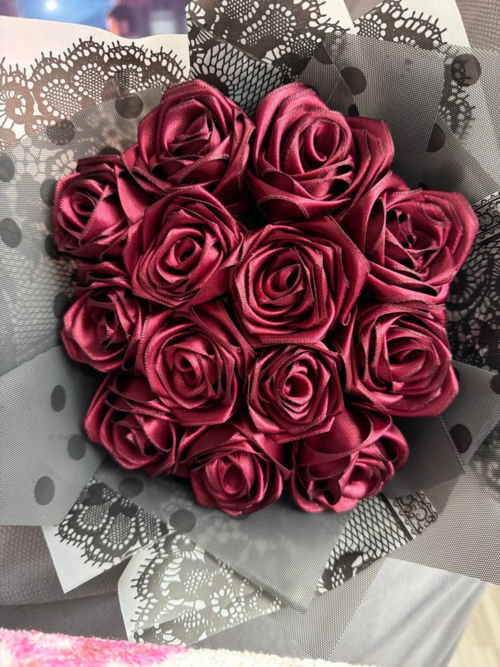 Bordo kumaş güller, siyah dantel ve ince ambalaj ile şık ve kalıcı bir gül buketi oluşturuyor.