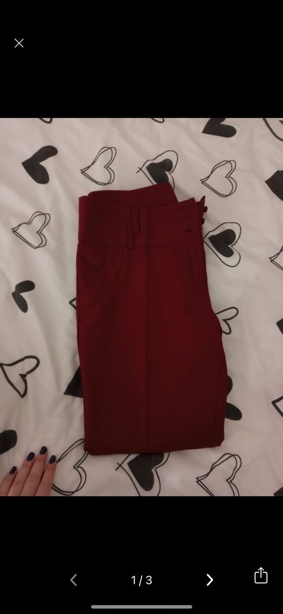 Bordo renk, midi boy, düz kesim kadın kumaş pantolon. Günlük sokak stiline uygun, minimalist ve şık görünüme sahip.