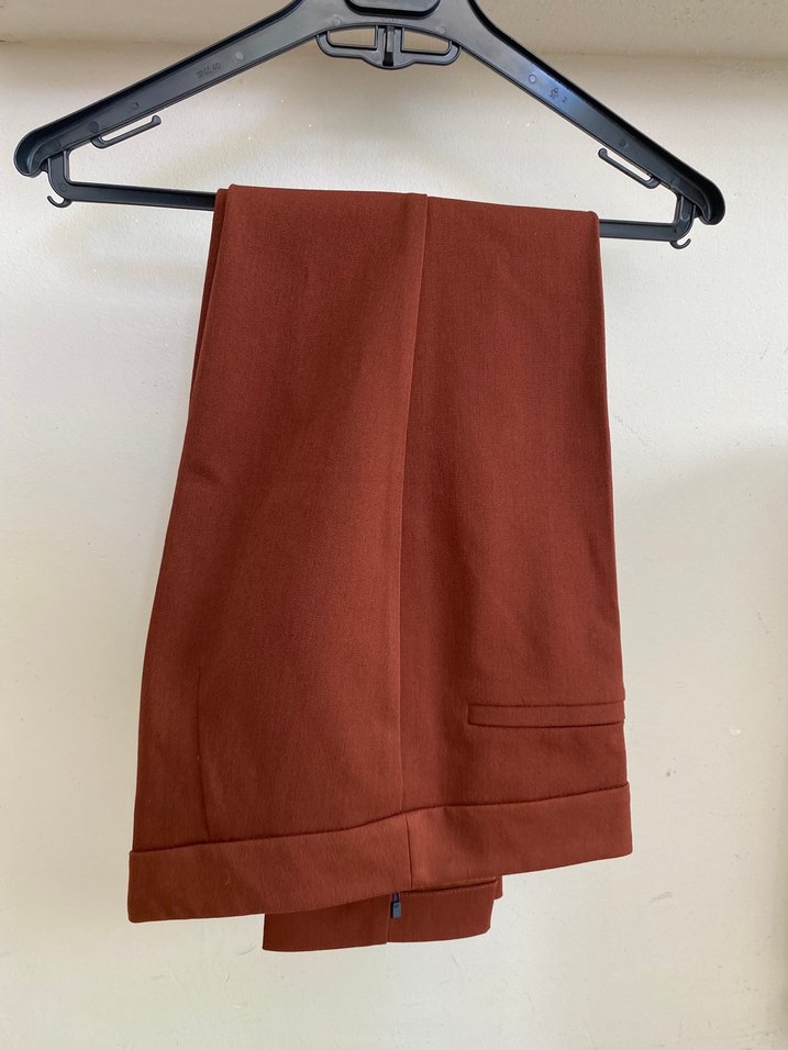 Bordo renkli, midi boy, regular fit kadın kumaş pantolon. Minimalist, desensiz tasarımı ve pürüzsüz sentetik kumaşıyla ofis stiline uygun, zahmetsiz şıklık sunar.