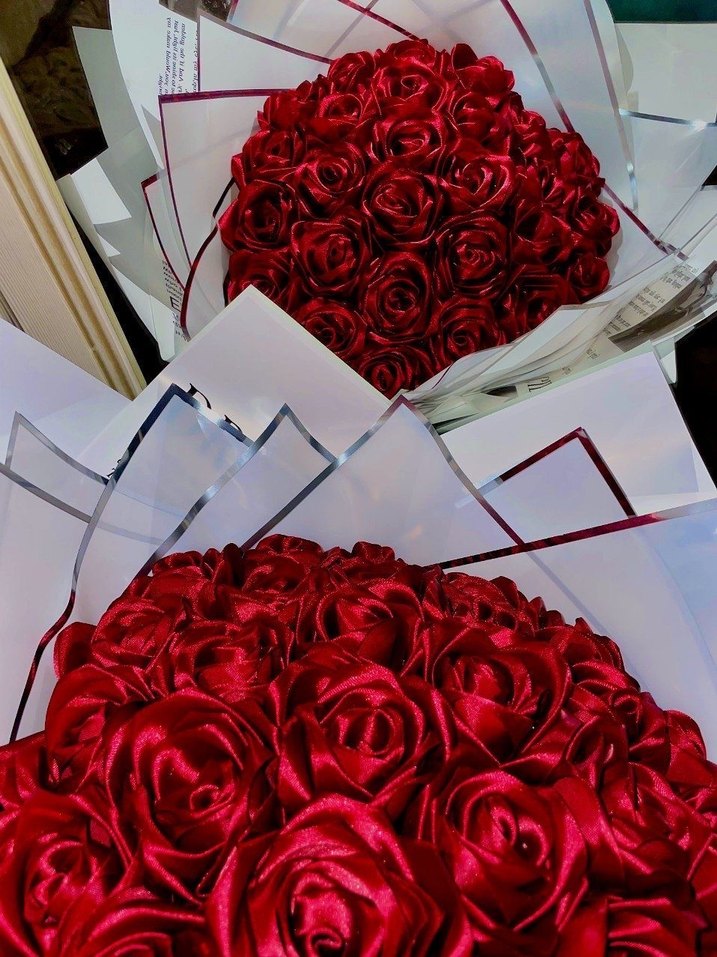 Bordo saten güllerden oluşan bu gelin buketi, zarif kurdele detayıyla cesur ve gösterişli bohem tarz sunar.