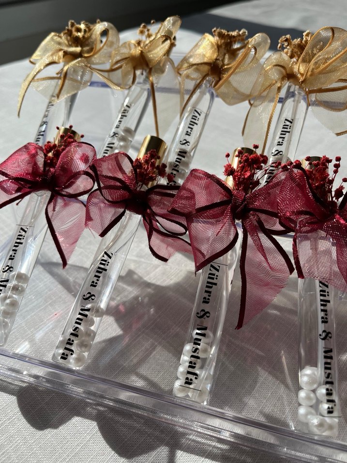 Bordo kurdela, altın fiyonk ve beyaz incilerle süslenmiş, isim yazılı hediyelik şeffaf kolonyalar❤️