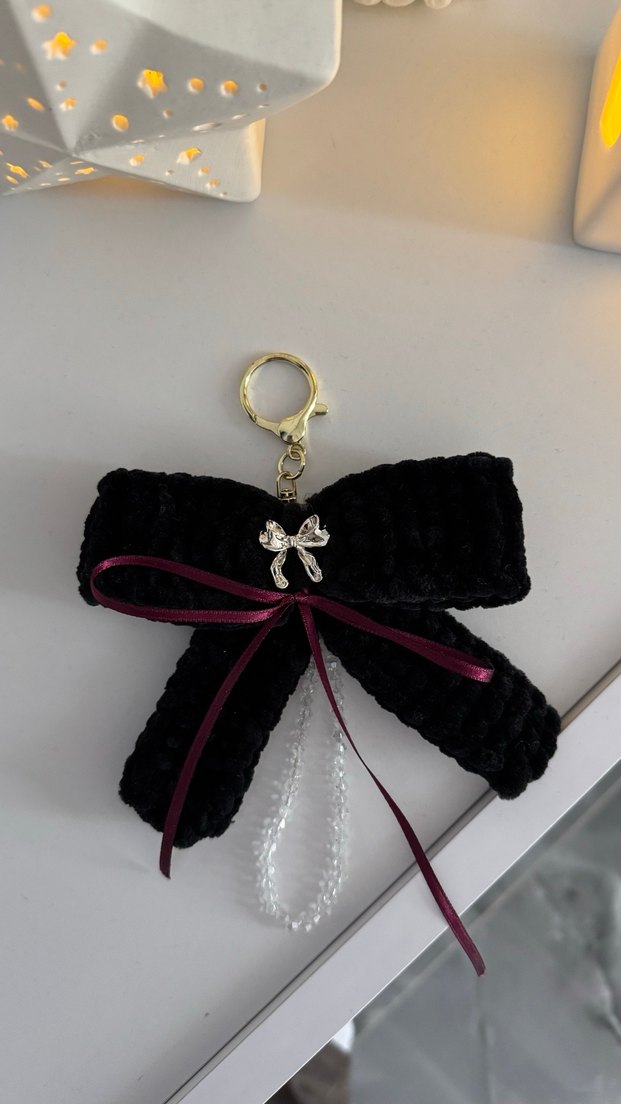 Siyah kadife dokulu anahtarlık, bordo kurdele ve küçük gümüş detaylı charm ile klasik ve rahat gotik tarzı yansıtıyor. İstenilen renkte sipariş üzerine yapılır.