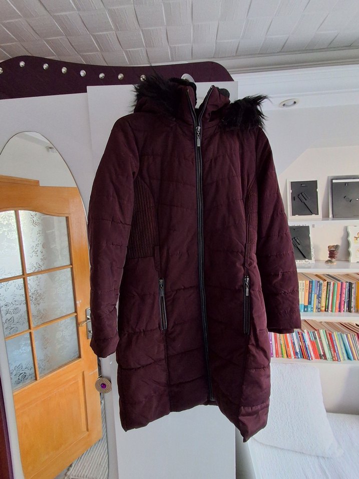 Bordo renkli, kürk detaylı kapüşonlu uzun kışlık kadın mont. Yumuşak ve sıcak kumaştan, kesimi vücuda oturan, etek ucu uzun, uzun kollu ve kesik yaka tasarıma sahiptir.